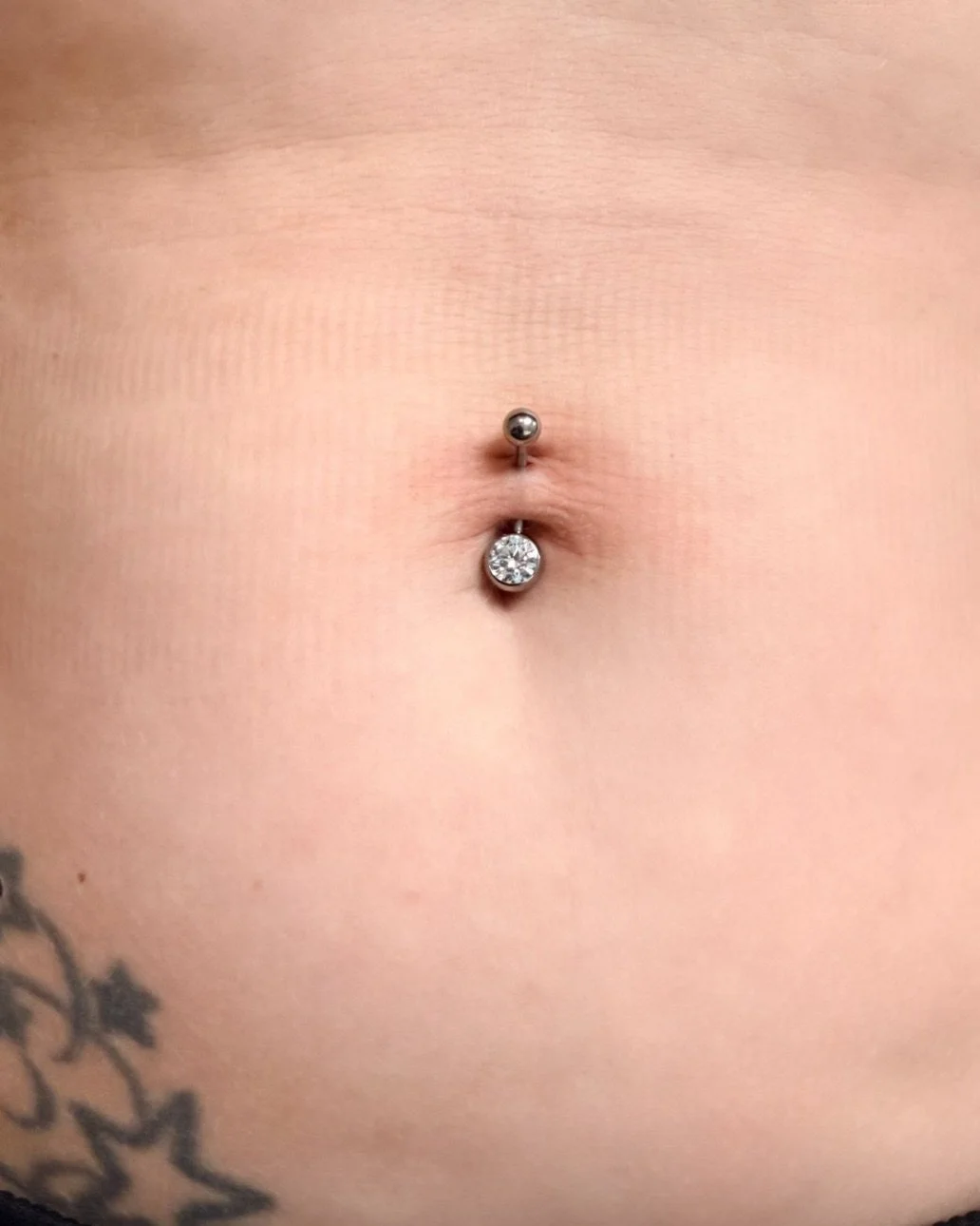 - Titanium Curved Bar - diamond with a chosen colour of your choice is included in the price as my standard. Some belly’s aren’t suitable for a traditional bar if your belly folds as you sit - it may need a floating bar to avoid any complications .. where the large diamond is at the top and the smaller disc is at the bottom.
